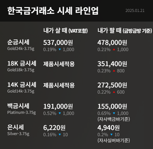 백금시세는 3.75g당 전날 마감 시세보다 1,000원 상승하여 150,000원에 팔 수 있으며, 은시세는 3.75g당 전날 마감 시세보다 10원 하락한 4,780원에 판매할 수 있다고 합니다.
