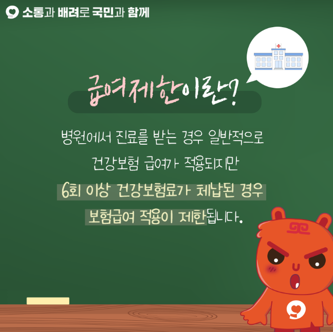 병원에서 진료를 받는 경우 일반적으로 건강보험 급여가 적용되지만 6회 이상 건강보험료가 체납된 경우 보험급여 적용이 제한된다고 합니다.