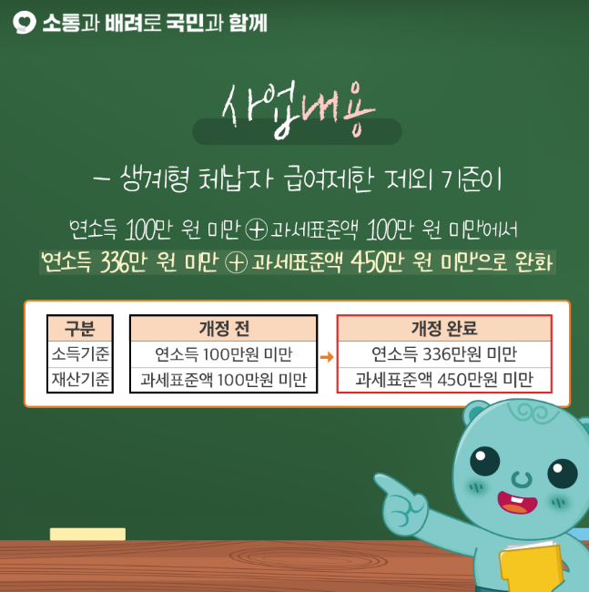 '연소득 336만 원 미만 ⊕ 과세표준액 450만 원 미만'으로 완화