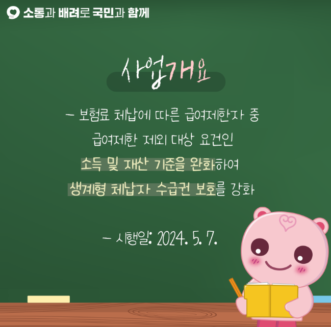 - 보험료 체납에 따른 급여제한자 중 급여제한 제외대상 요건인 소득 및 재산 기준을 완화하여 생계형 체납자 수급권 보호를 강화