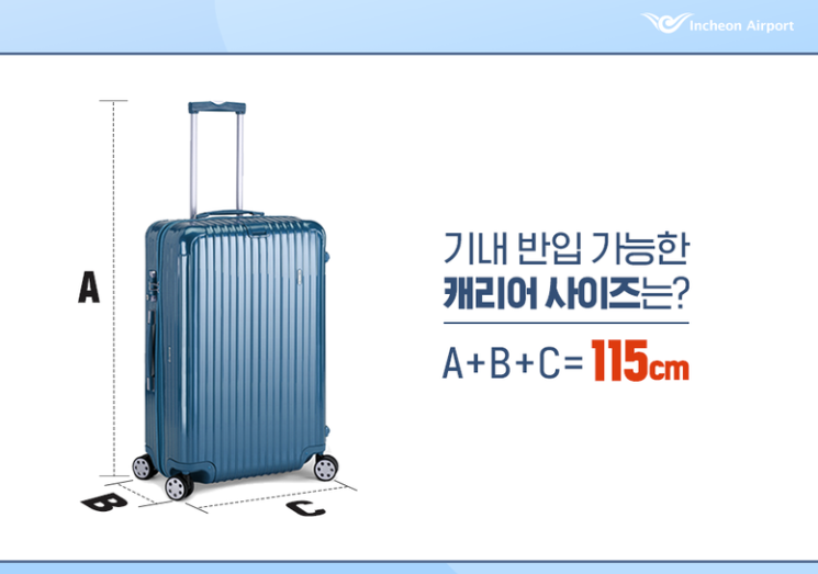 캐리어 세 변의 총 합이 115cm 이내가 되어야 합니다. 시중에 판매되고 있는 기내용 캐리어는 가로 40cm, 세로 20cm, 높이 55cm로 많이 나오는데 보통 21인치 이하의 사이즈로 준비해야 기내 반입이 가능합니다. 기내 수하물의 무게는 항공사에 따라 12kg부터 7kg까지 차이가 있으니 탑승 전 꼭 항공사 규정을 확인해야 합니다.