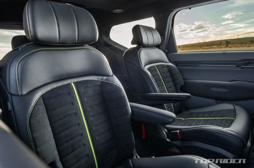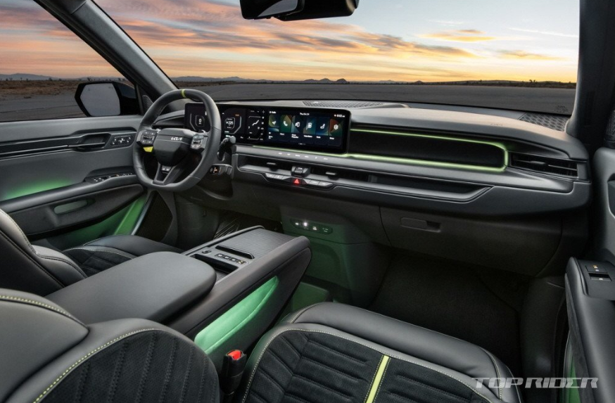 실내에도 스티어링 휠과 시트 등 곳곳에 형광색 포인트가 추가됐습니다. 스포츠 시트는 알칸타라 스웨이드 인서트로 장식됐지만, GT 로고가 각인됐습니다. 12.3인치 디스플레이에는 GT 전용 그래픽이 내장됐다고 합니다. EV9 GT는 최신 ADAS를 기본으로 향후 구독 서비스를 통해 옵션 추가가 가능합니다.