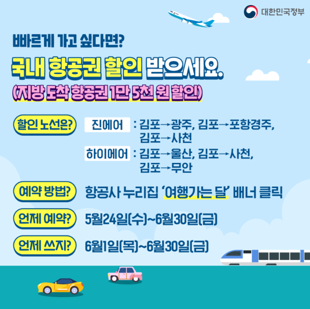 "일상에 쉼표를, 지역에 온기를, 경제에 활력을" 6월 기차, 렌터카, 국내 항공권 등 다양한 여행 교통 '알짜정보'를 확인해 보세요!