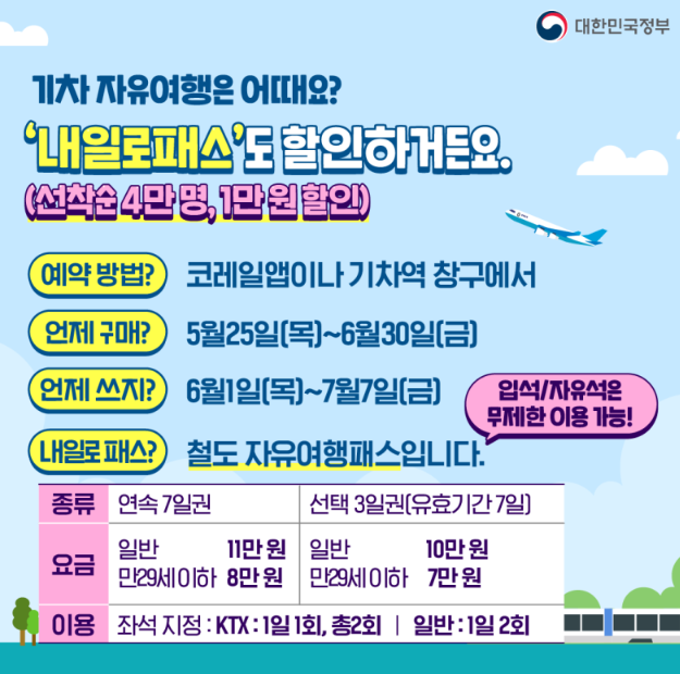 '내일로패스'도 할인합니다.(선착순 4만 명, 1만 원 할인)