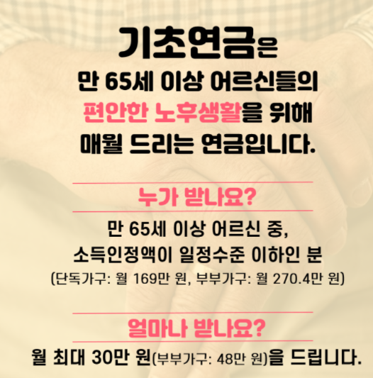 만 65세 이상 어르신 중 소득인정액 일정수준 이하인 분(단독가구원 169만원, 부부가구 월 2,704,000원)