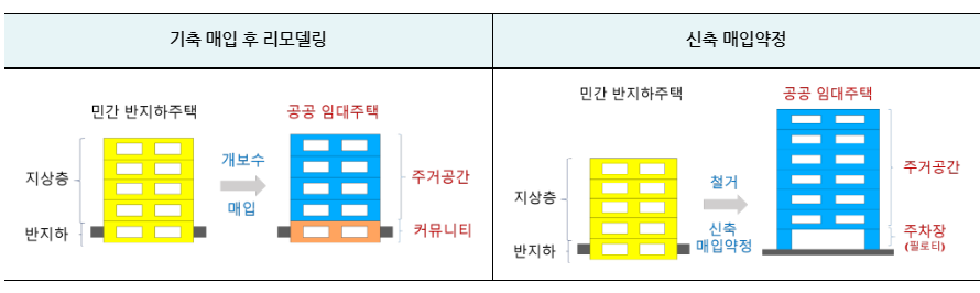 기존 개별 반지하주택은 신축 매입약정 등을 통하여 공공이 매입하여 지상층은 공공임대주택, 지하층은 커뮤니티 시설(공동창고 등)로 활용합니다.