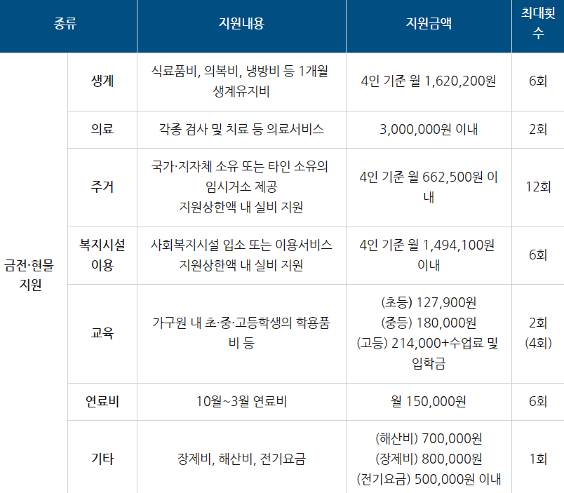 ② 지원내용 : 생계·의료·주거·복지시설·교육·연료비 등에 대한 금전·현물을 통한 직접지원 또는 민간기관 연계를 통한 지원