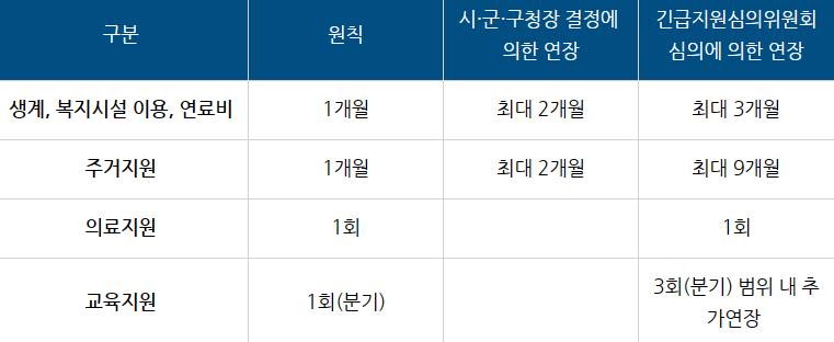 - (원칙) 생계·주거·복지시설이용·연료비는 1개월/의료·교육 지원은 1회
