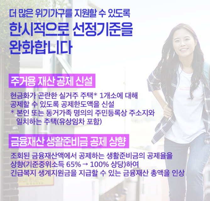 더 많은 위기가구를 지원할 수 있도록 한시적으로 선정기준을 완화한다고 합니다.