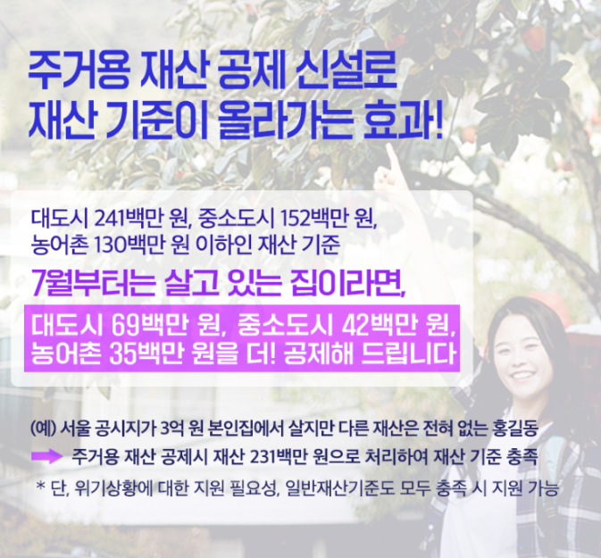 대도시 241백만 원, 중소도시 152백만 원, 농어촌 130백만 원 이하인 재산 기준