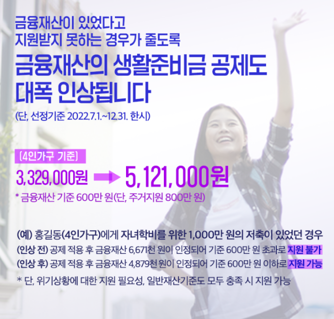 금융재산이 있었다고 지원받지 못하는 경우가 줄도록 금융재산의 생활준비금 공제도 대폭 인상됩니다.(단, 선정기준 2022년 7월 1일부터 12월 31일까지 한시 적용)