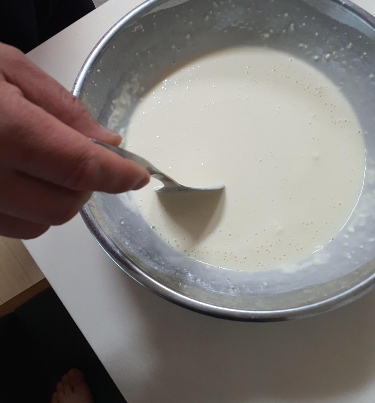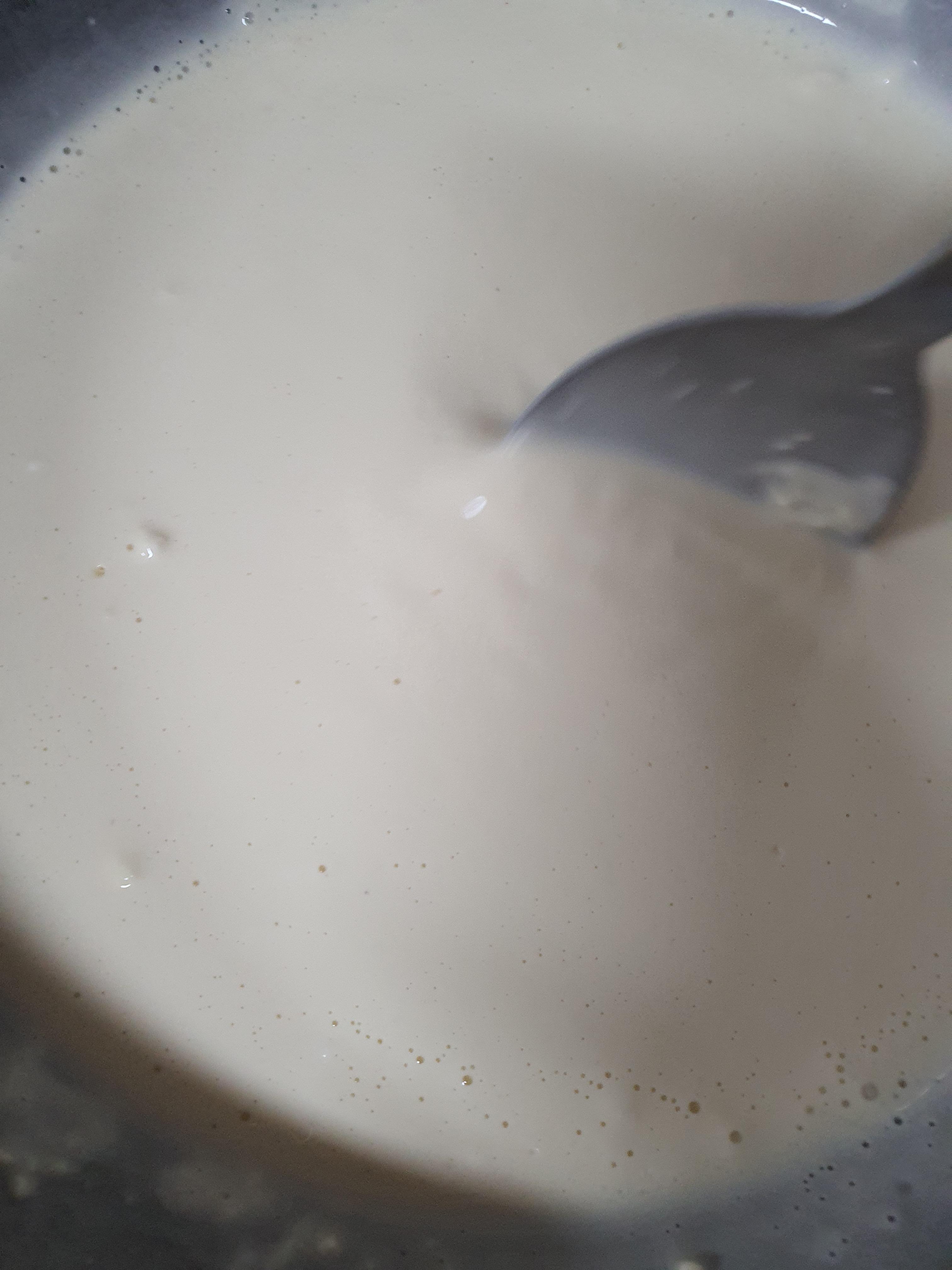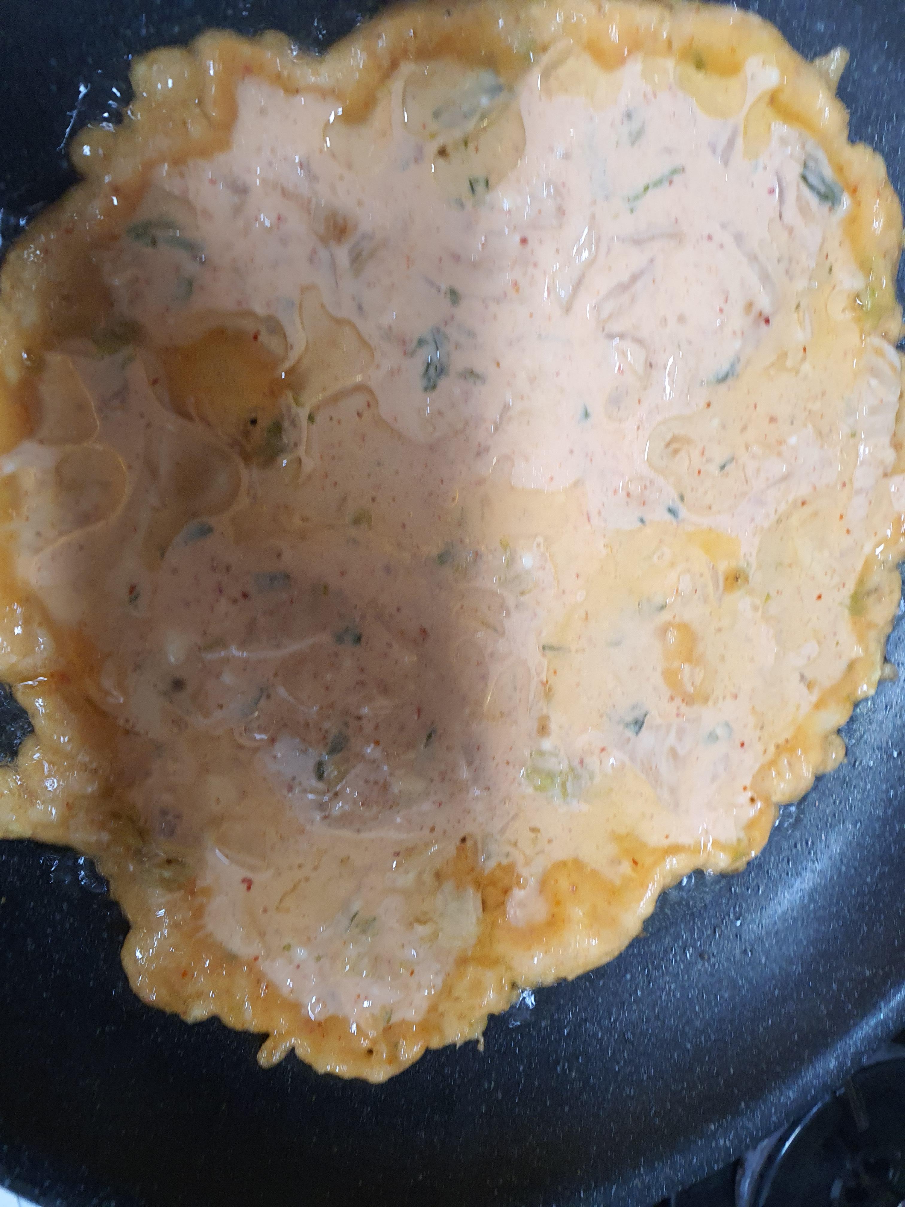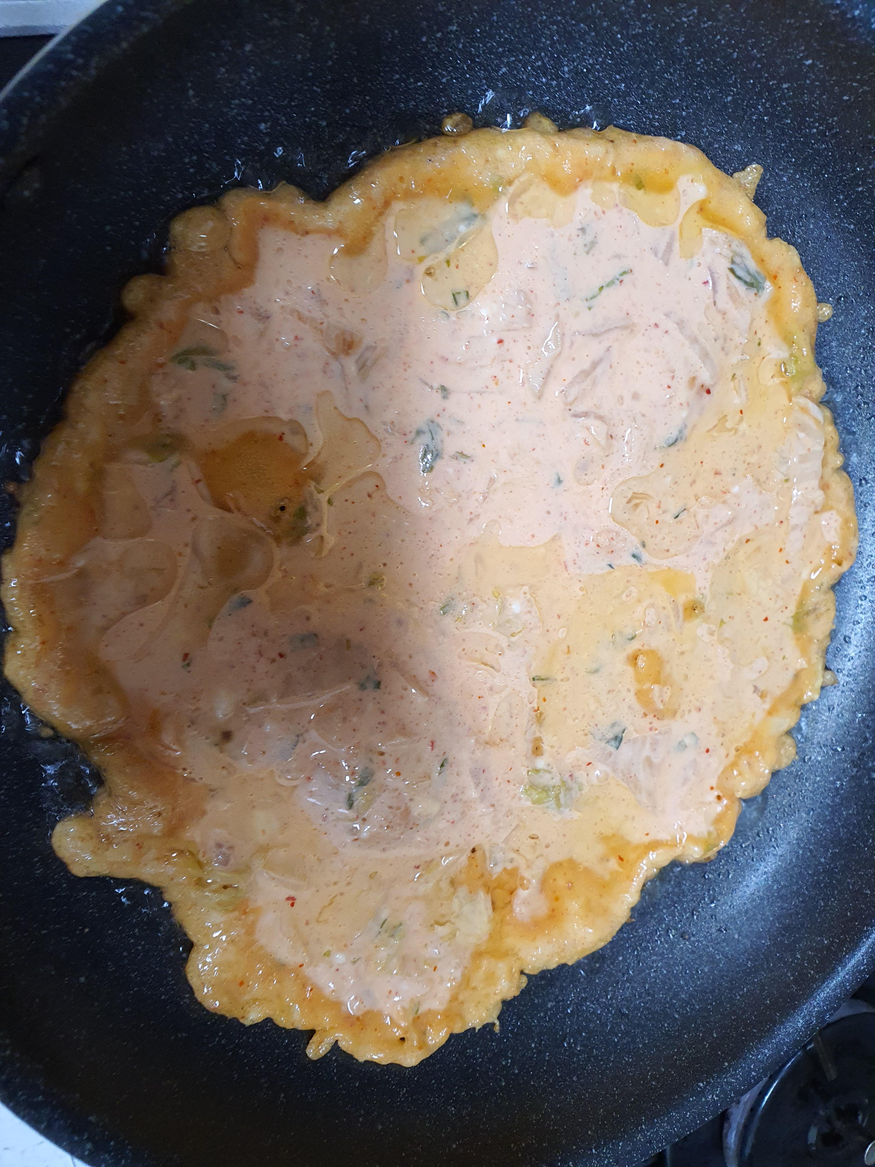 5. 이젠 달군 후라이팬에 두 국자정도 넣어 넓게 펼쳐줍니다. 그리고, 어느정도 익으면 뒤집어 줍니다.