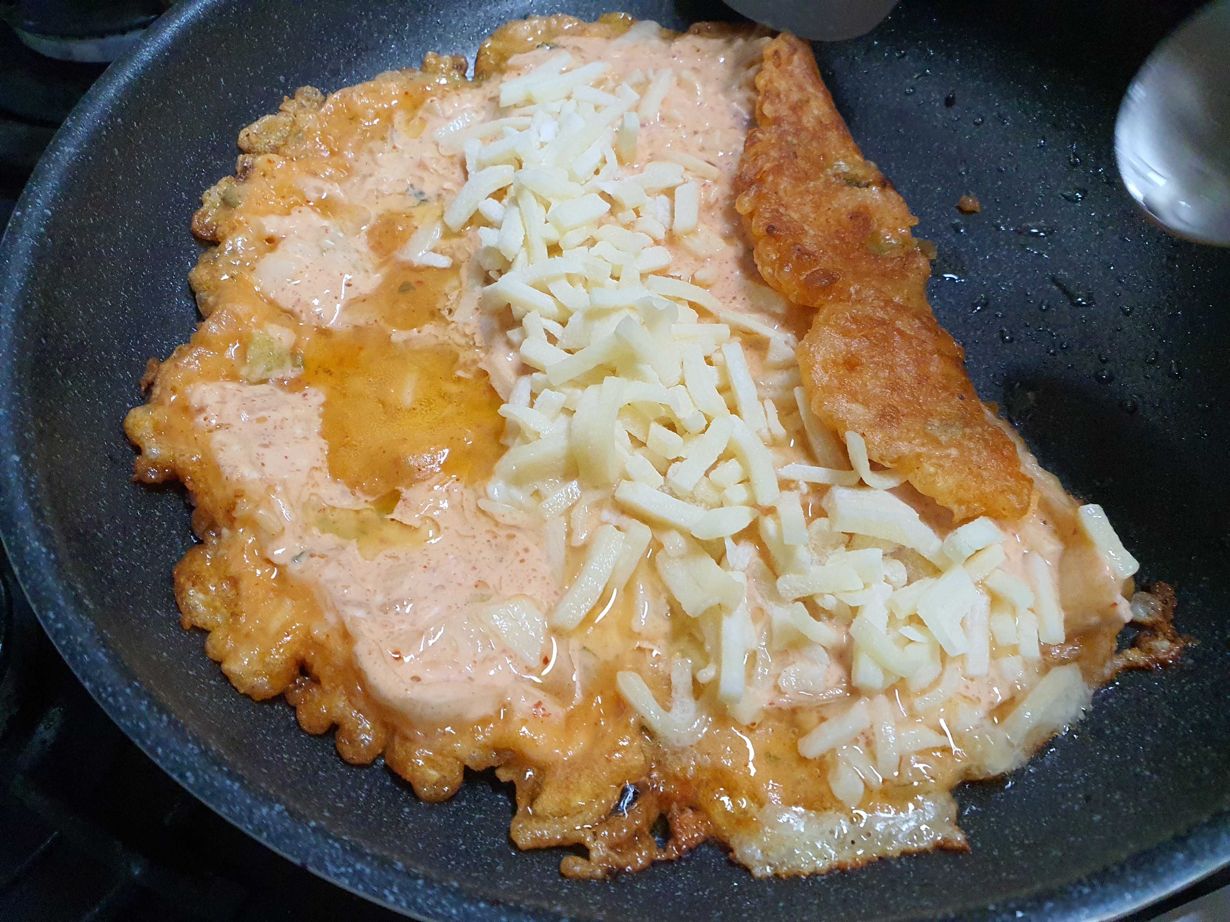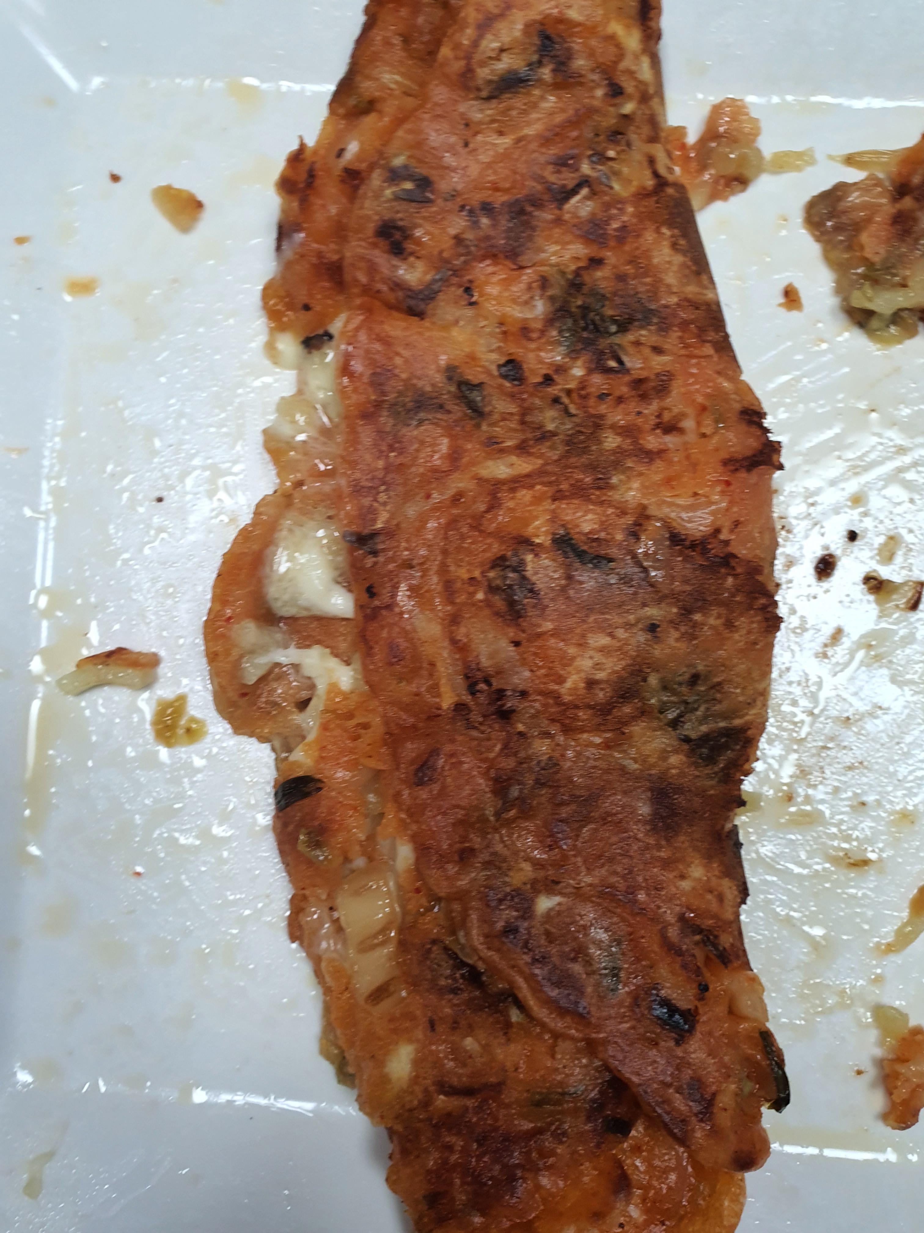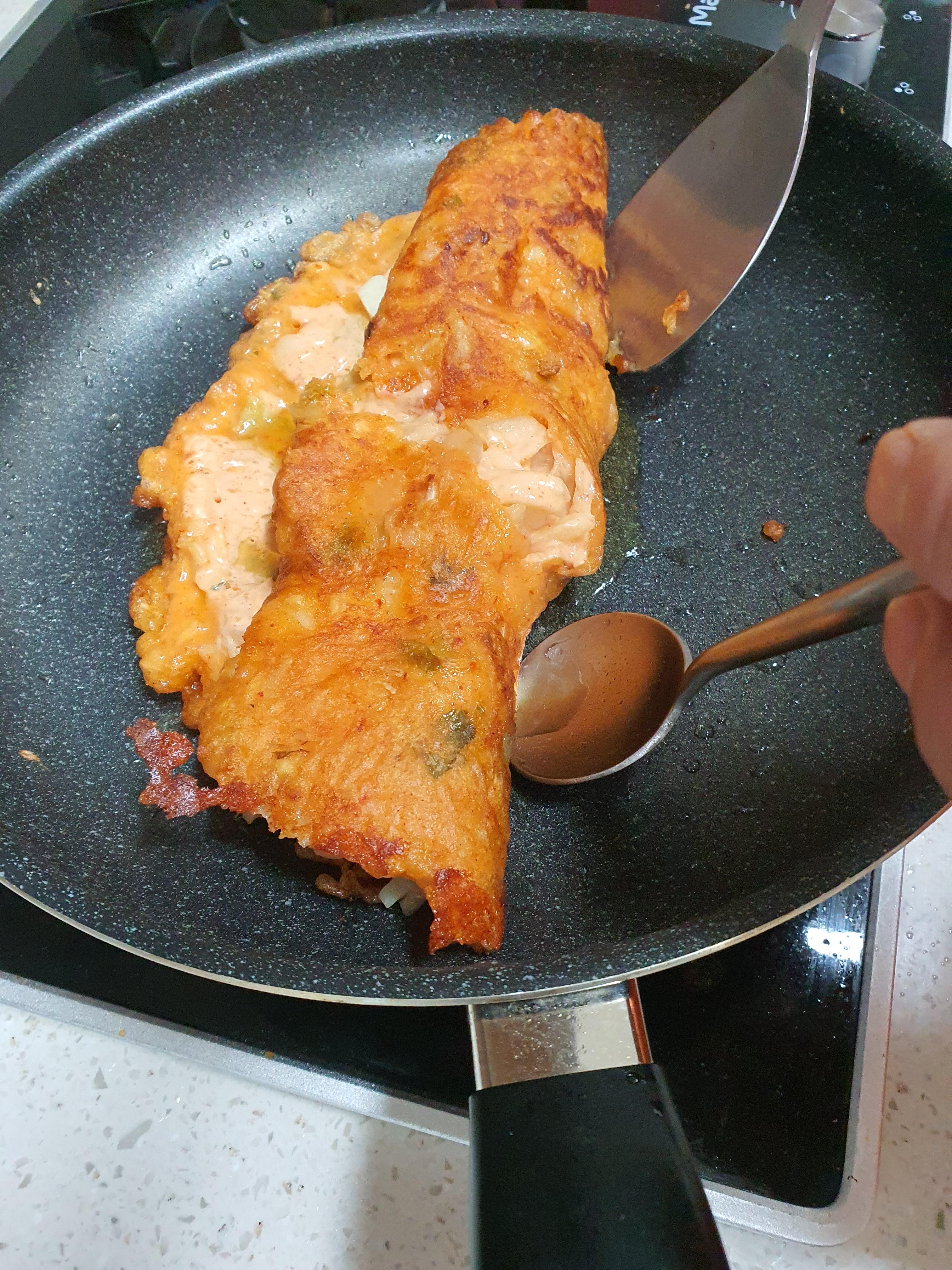 저희도 처음 해보는 거라 처음에는 한 쪽만 익히고 치즈를 넣어 돌돌 말아주었더니 속이 덜 익더라구요