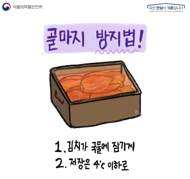 김치 표면을 위생 비닐로 덮거나 국물에 잠기게 해서 김치 표면이 공기 중에 노출되지 않도록 보관하고 저장 온도는 4℃ 이하의 저온으로 유지하는 것이 좋습니다.