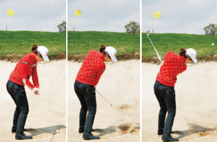 이런 스윙은 벙커를 탈출하더라도 런이 많아지므로 원하는 지점에 볼을 보내기 어렵다고 합니다.