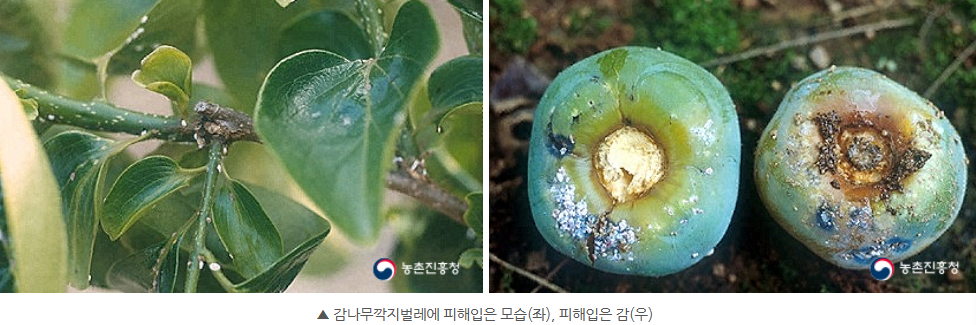 가지와 잎 등에 기생하며 즙액을 빨아먹기 때문에 수세가 약화되고 심할 경우, 말라죽고 과실이 떨어집니다. 그을음병을 유발해 감 농가에 큰 피해를 준다고 합니다.