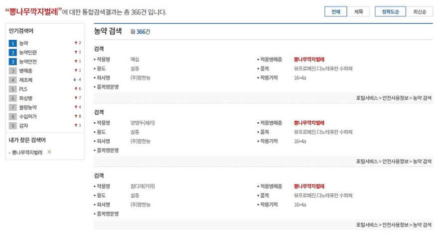 '뽕나무깍지벌레'만 입력했을 뿐인데, 작물명부터 회사명, 작용기작, 사용하면 효과적인 작물과 병해충까지 한눈에 볼 수 있습니다.