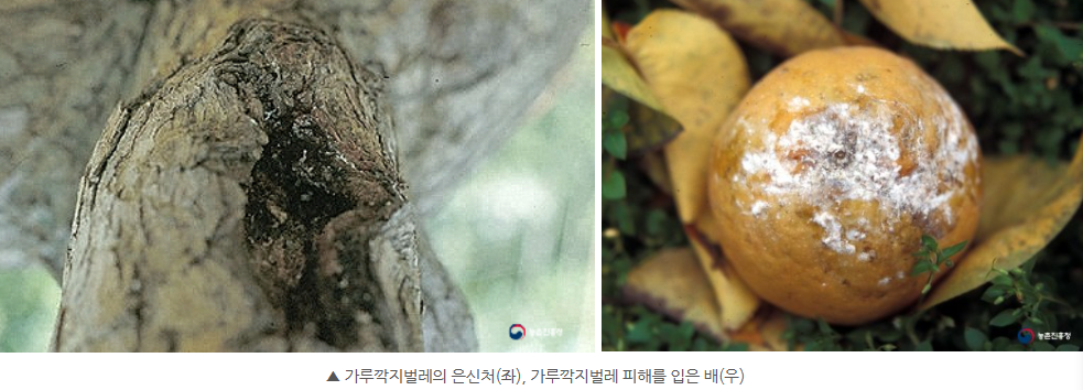 특히, 봉지를 씌워둔 과실에 피해가 크다고 합니다. 흡즙부위가 움푹 들어가 기형과가 되고 배설물로 그을음병이 발생해 품질이 저하된다고 합니다.