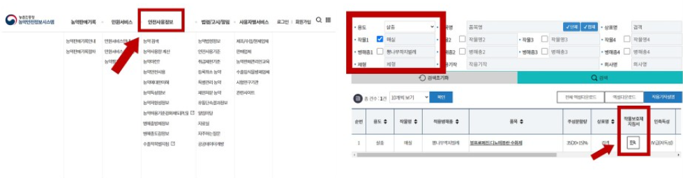 더 자세히 알아보고 싶다면, 화면 상단의 '안전사용정보' → '농약검색'을 누르고 검색하시면 농약의 주성분, 인축독성, 희석배수, 안전사용 시기 등이 나와있다고 합니다.