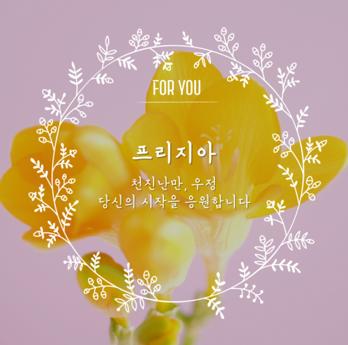 봄과 너무 잘 어울리는 노란빛의 프리지아. 피리지아는 그 향이 좋고 오래가서 곁에 두면 눈도 크고 즐거워지는 꽃입니다. 그 빛깔과 향 때문에 곁에 두고 싶은 꽃입니다. 노란색이 너무나도 예쁜 프리지아는 탱글탱글한 꽃잎과 맑은 녹색을 띈 줄기를 가지고있어 보고만 있어도 생기가 도는 마법같은 꽃입니다. 흰색의 프리지아 역시 청초한 자태를 뽐내며 봄을 부르는데 흰색 꽃잎에서는 백합과 같은 순수함이 더욱 강하게 느껴집니다. <천진난만, 우정, 당신의 시작을 응원합니다>라는 꽃말과 잘 아울립니다.