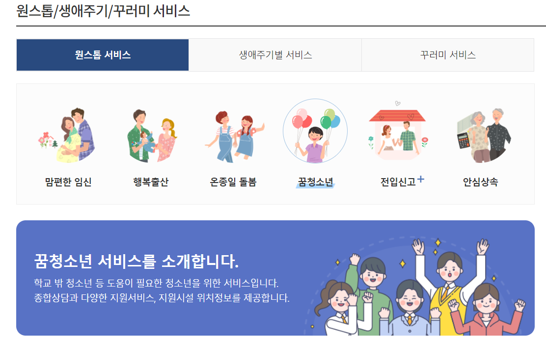 지원 서비스 | 원스톱 서비스(꿈청소년) | 똑똑한 서비스 | 정부서비스 | 정부24 (gov.kr)