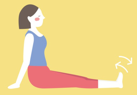 1. 양손을 등 뒤 바닥에 대고, 무릎을 펴고 앉습니다. 발목을 세워 몸쪽으로 당겼다가 펴는 동작을 5~10회 반복합니다.