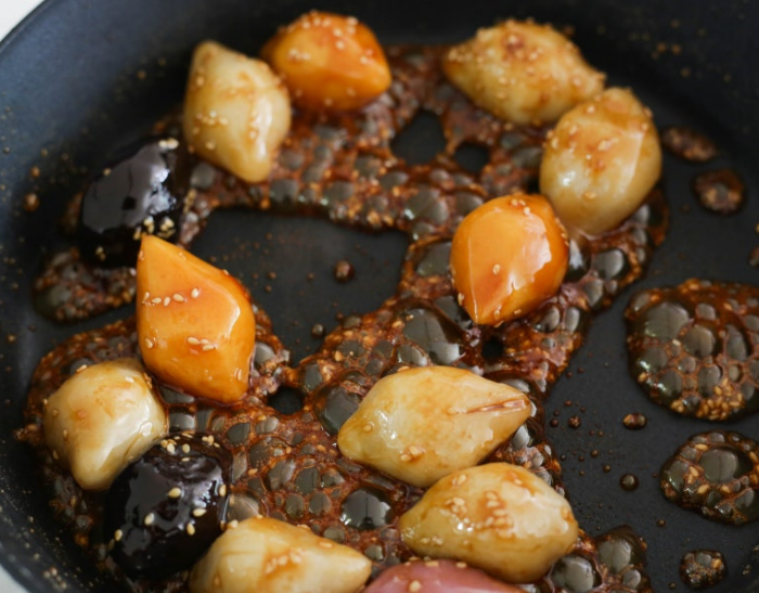 어떤 속이 들어가도 간장 양념과 잘 어울립니다. 후라이팬에서 양념을 자글자글 졸여주는 것이 포인트입니다. 다만 강불에서 익히면 양념 재료가 금방 탈 수 있으므로 중 약불에서 불조절을 해주어야 합니다.
