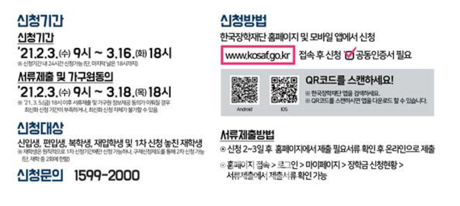 한국장학재단 누리집이나 모바일을 통해 마감 날인 3월 16일 18시까지 신청 가능하다고 합니다.