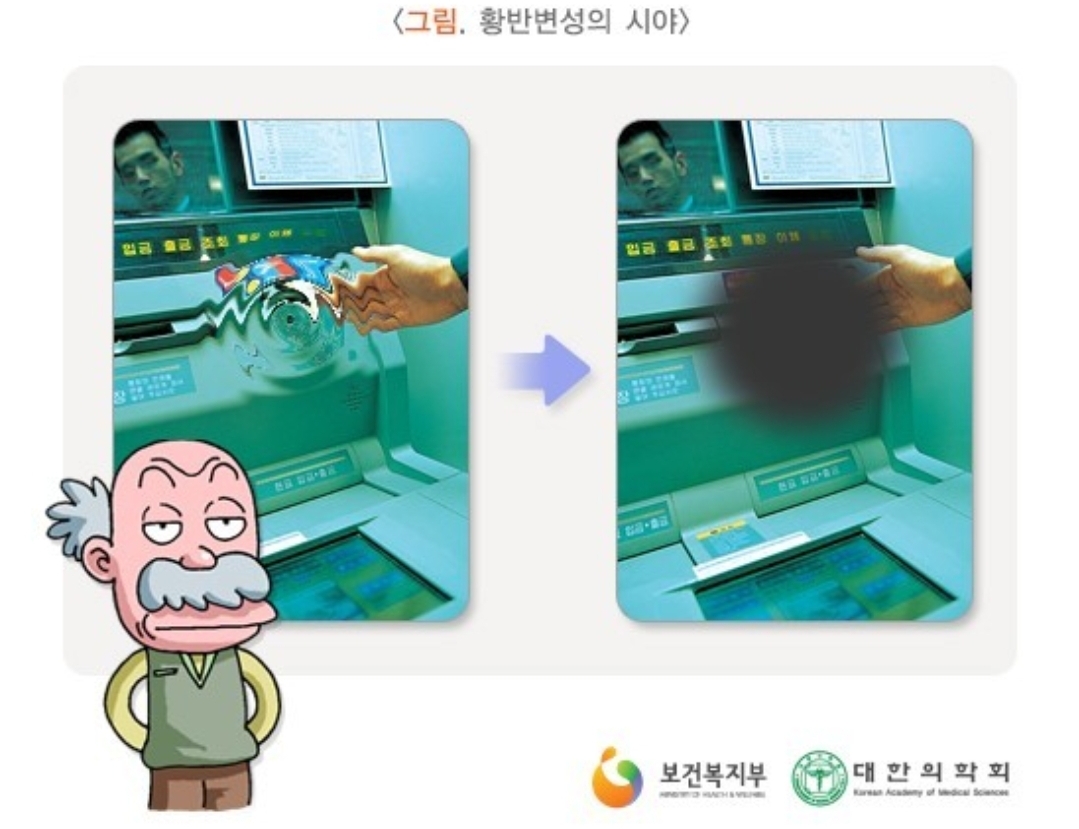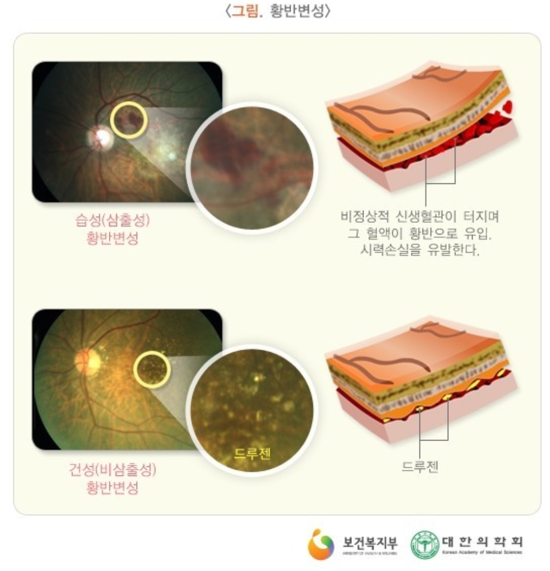 나이가 들면서 눈의 망막 중심 부분인 황반에 출혈, 부종, 시세포 변성 또는 위축으로 시력이 감소하고 실명을 초래하는 변성 질환을 말한다고 합니다.