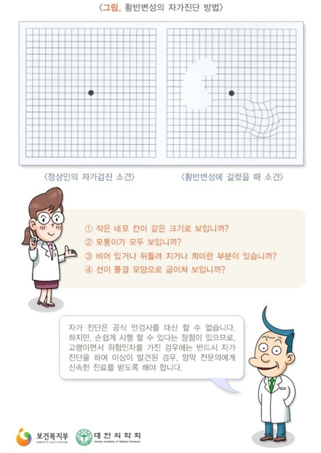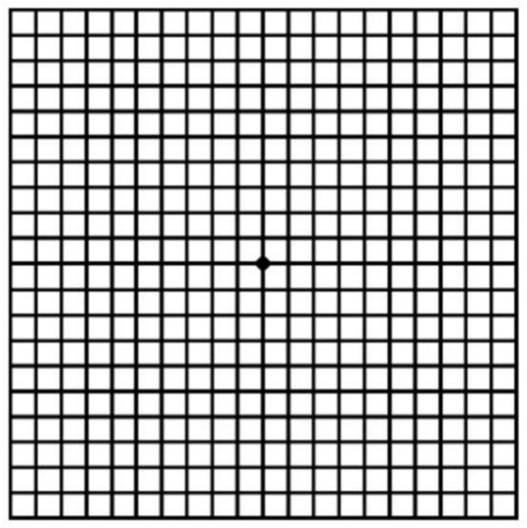 만약 가운데 점이 잘 보이지 않거나, 같은 크기로 보이지 않거나, 선이 휘어 보이고 끊어져 보이거나, 안보이는 부분이 있다면 안과 전문의의 안저 검사 등을 받는 것이 좋다고 합니다.
