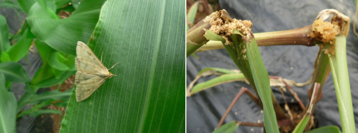 수수, 조, 기장 등 화본과 작물에 피해를 주는 조명나방은 전체적으로 황갈색을 띠고 날개 하단부는 담갈색으로 한 줄의 황색띠를 가지고 있습니다. 줄기 안쪽에 숨어 갉아먹기 때문에 피해를 받으면 줄기에 배설물 흔적이 보입니다.