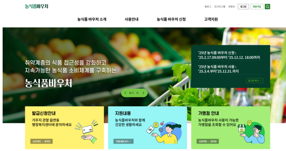 - 신청방법 : 농식품 바우처 지원사업 누리집, 전화, 주민센터 방문 신청
