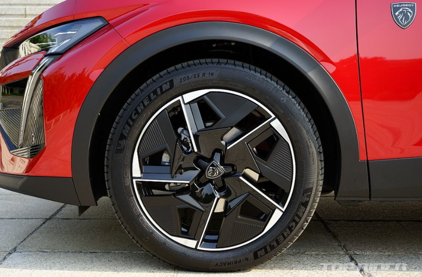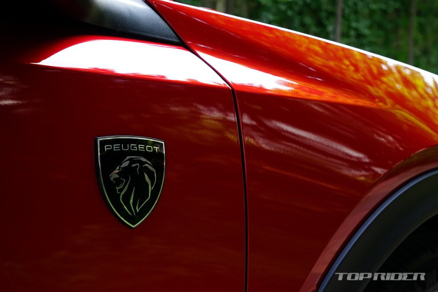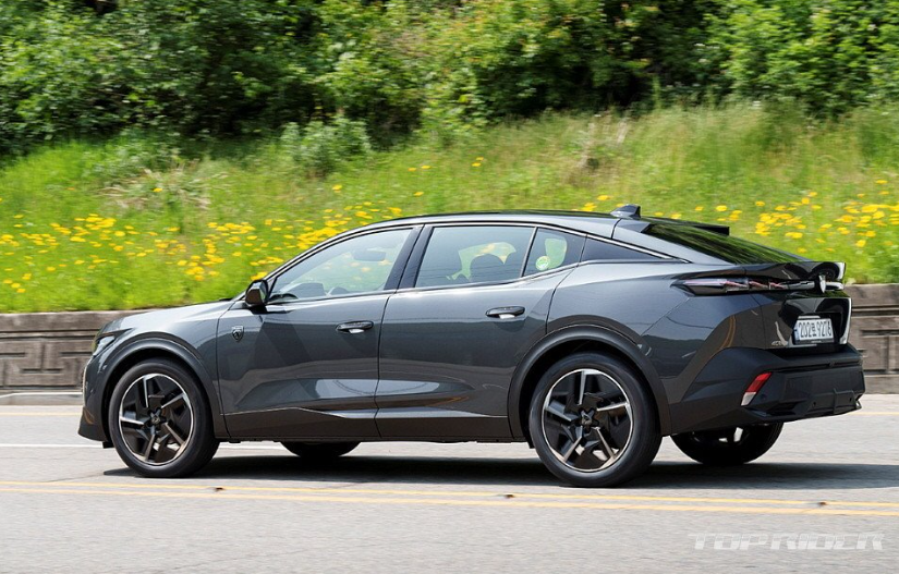 측면에서는 SUV 대비 낮은 전고와 SUV 수준의 최저지상고를 통해 크로스오버 특유의 역동적인 분위기를 연출합니다. 완만하게 낮아지는 쿠페형 루프라인과 19인치 대구경 휠의 밸런스가 좋습니다. 특히 새롭게 적용되는 1열 도어의 방패형 푸조 엠블럼은 스포츠카 스타일입니다.