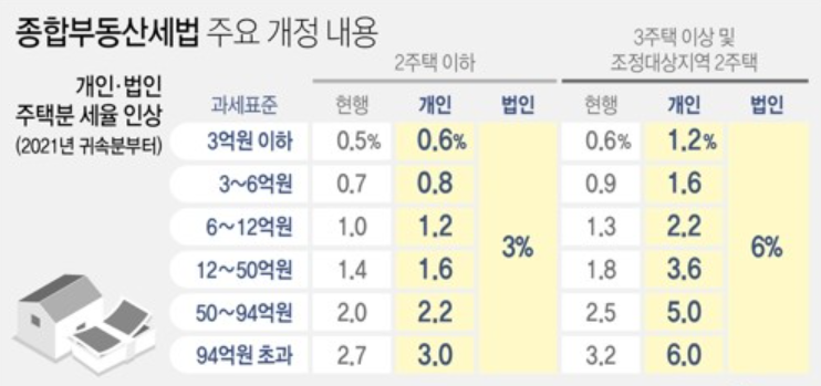 개정된 종부세법에 따라 주택을 보유한 법인에 대해선 기본적으로 단일 최고세율(3%·6%)을 적용하지만, 공공주택사업자와 공익법인, 건설임대주택사업자, 재건축·재개발 사업시행자 및 주택조합에 대해선 개인과 같은 일반 누진세율을 적용하기로 했다고 합니다.