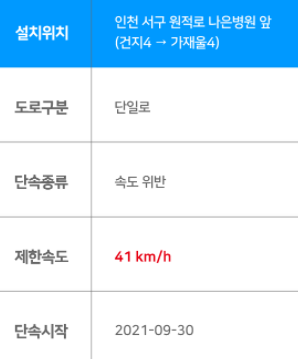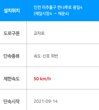 인천 단속카메라 신규 설치 1개, 단속 카메라 속도 변경 1개