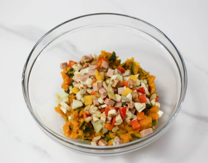 단호박 반 개, 햄 150g, 양파 1/3개, 파프리카 1/3개, 새송이 버섯 1개, 마요네즈, 소금, 후추, 식빵 2장, 채소 취향껏