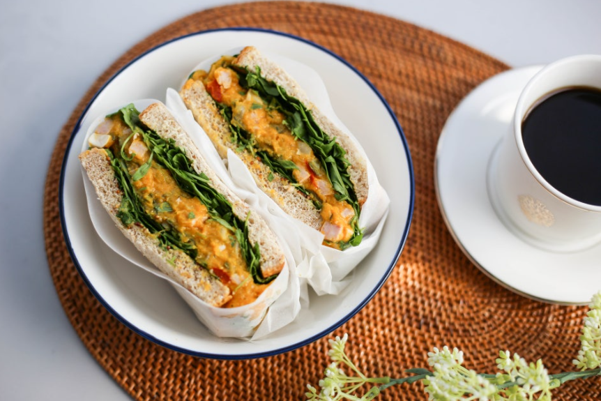 5. 식빵 사에에 좋아하는 채소와 앞에서 만든 내용물은 넣어주면 단호박 샌드위치 가 완성됩니다.