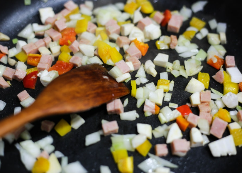 2. 햄, 양파, 파프리카, 새송이버섯은 잘게 잘라 기름을 두른 팬에서 볶아줍니다. 다 익은 재료는 한 김 식혀 준비합니다.