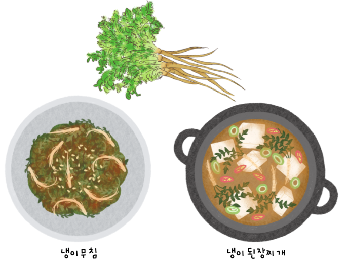 향긋한 맛이 있는 냉이는 단백질 함량이 높고 각종 비타민과 무기질이 풍부해 봄철 기력 회복에 도움을 주는 나물이라고 합니다. 특히 봄이 되면 괜스레 졸려지는 춘곤증을 예방하는 데도 효과가 있습니다.