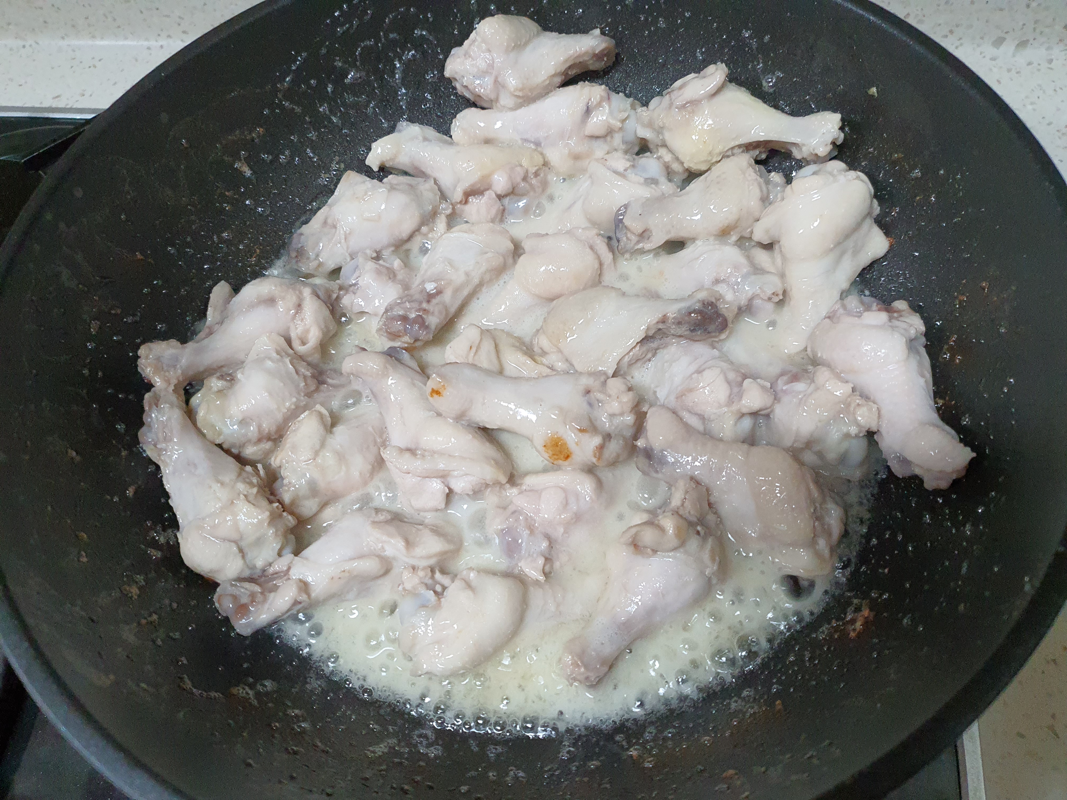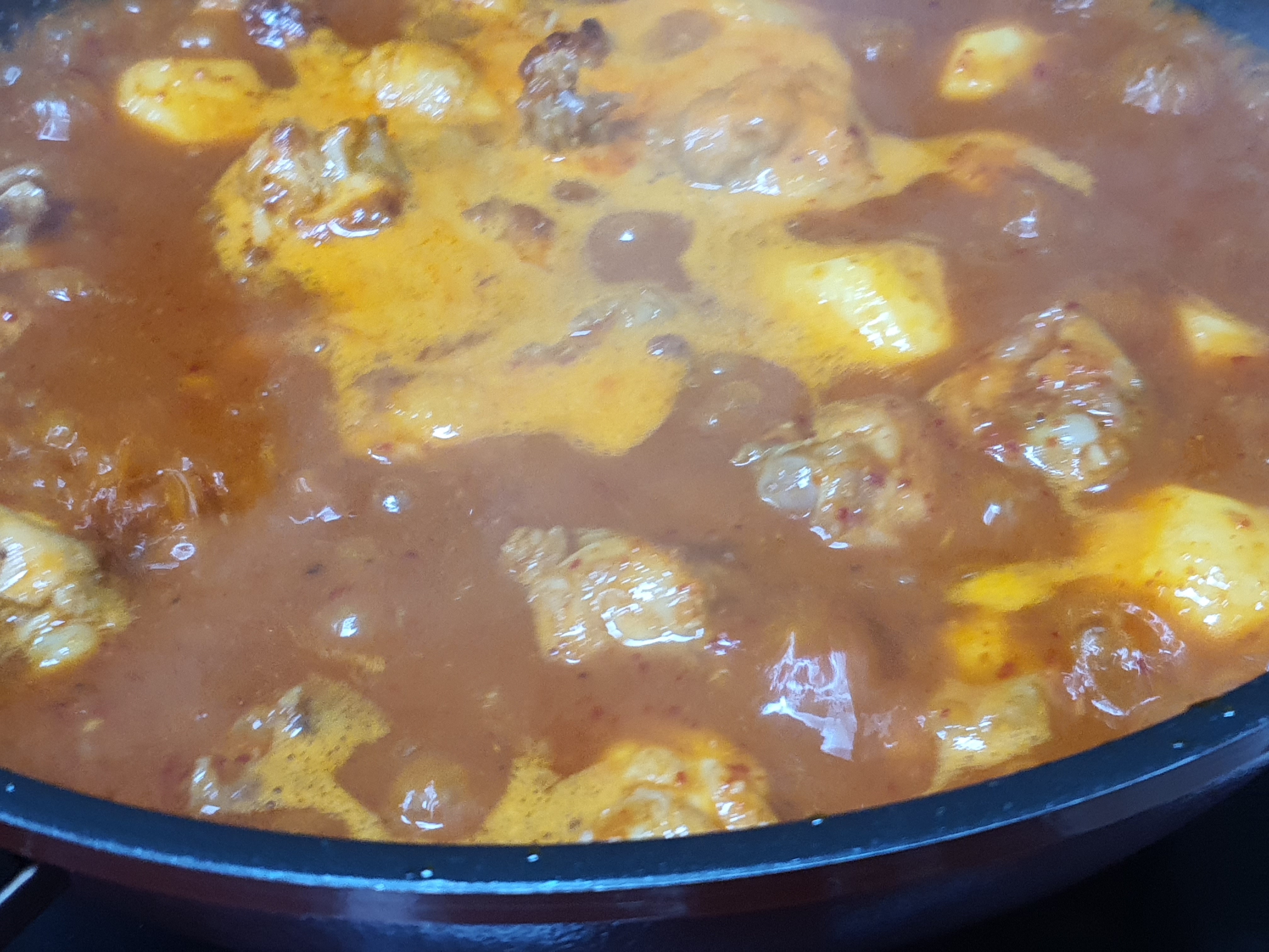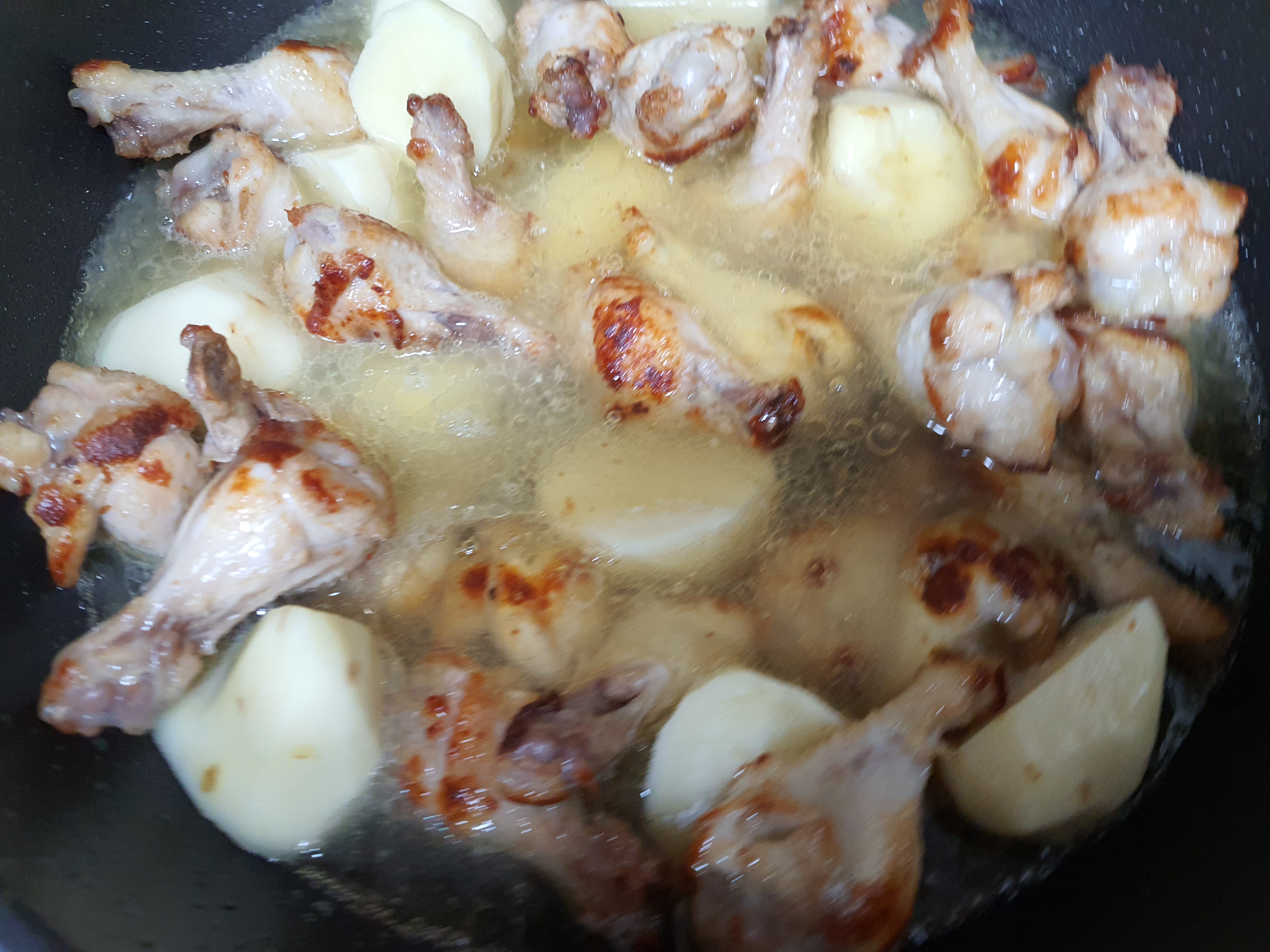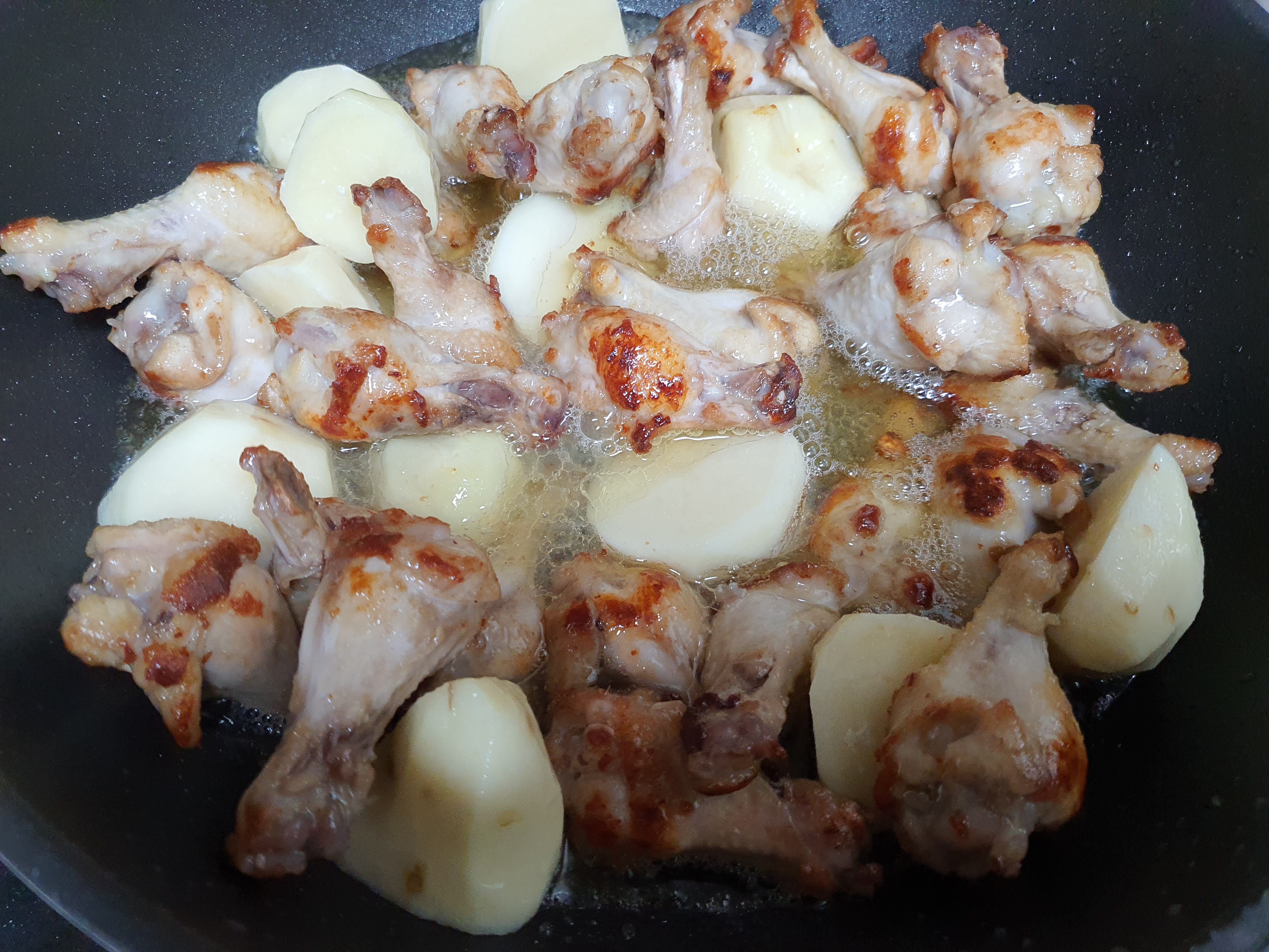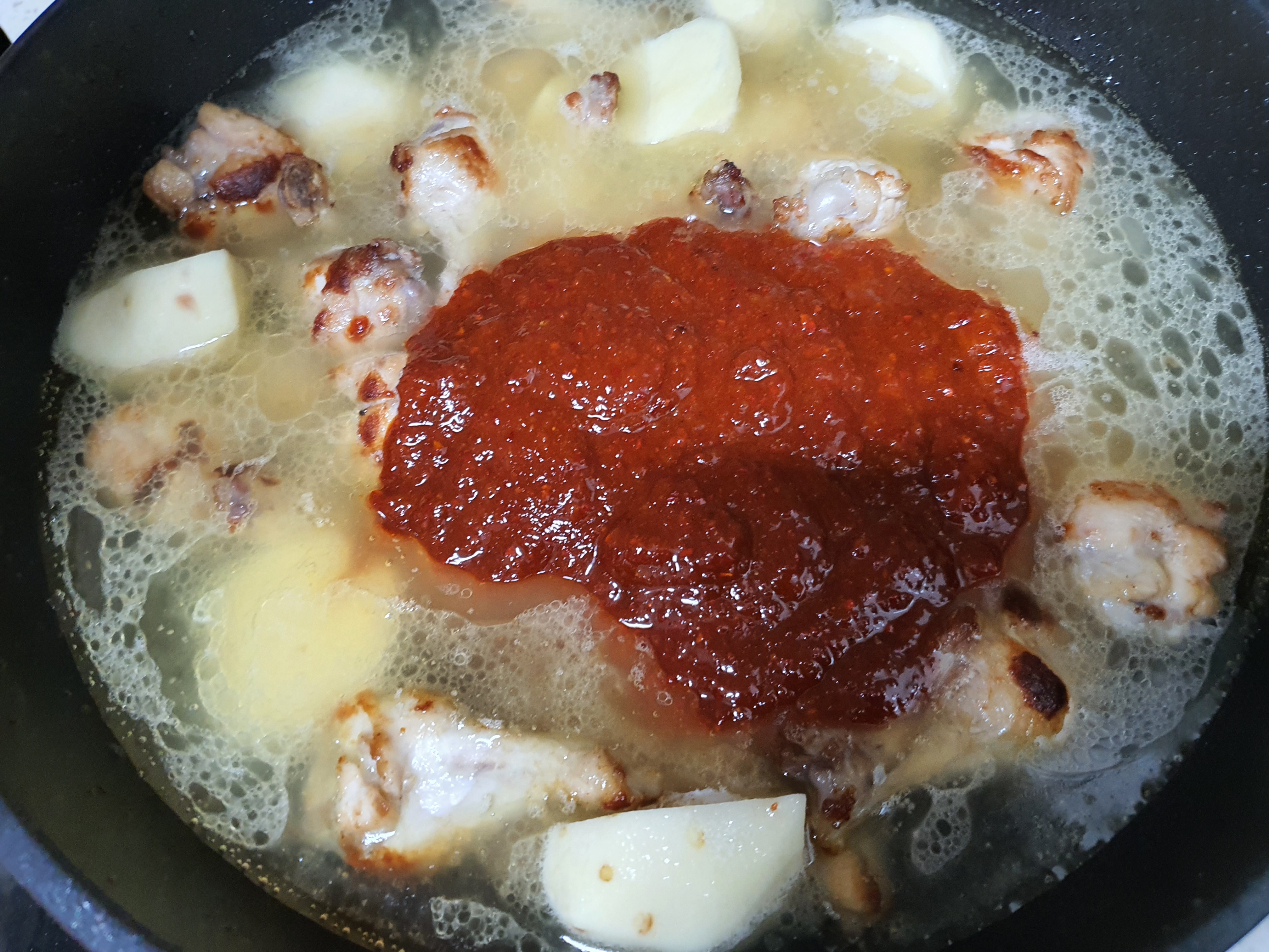 5. 닭봉과 감자가 잠길 정도로 물을 넣고 미리 만들어 놓은 양념장을 넣어 볶아줍니다.