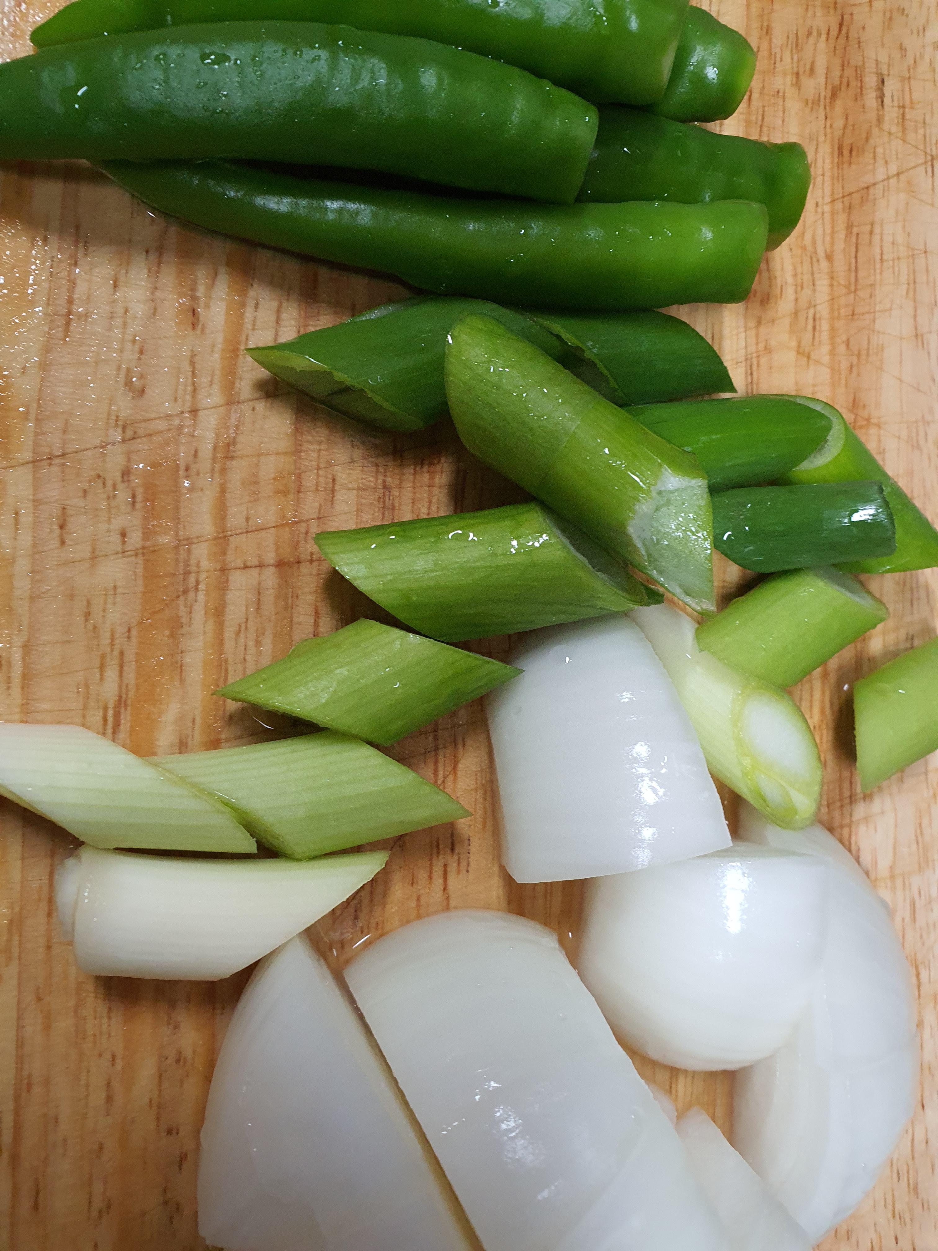 양파와 대파는 큼지막 하게 썰어주었고 청량고추는 그냥 꼭지만 제거해두었습니다.