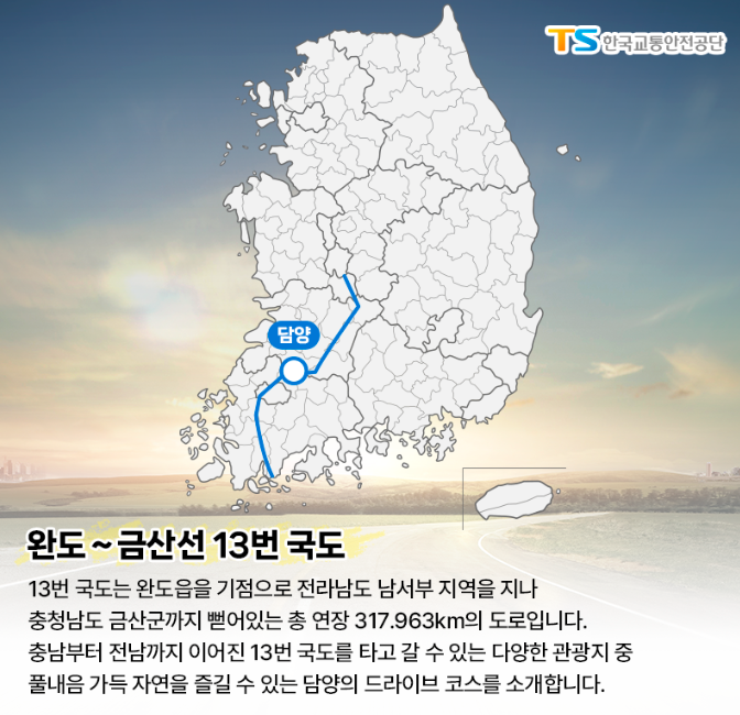 13번 국도는 완도읍을 기점으로 전라남도 남서부 지역을 지나 충청남도 금산군까지 뻗어있는 총 연장 317.963km의 도로입니다.