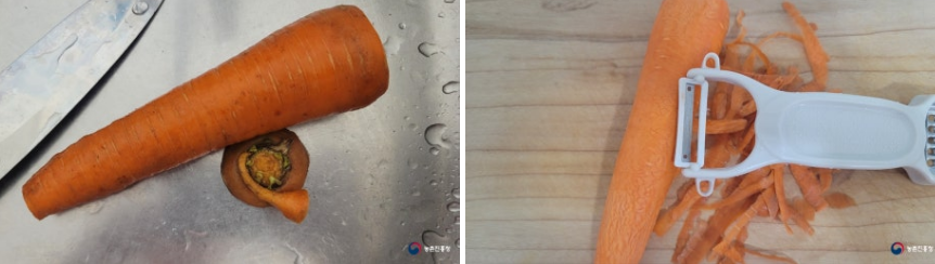 흐르는 물에 껍질을 깨끗이 씻고, 끝부분을 잘라주면 됩니다. 당근 껍질은 가볍게 벗겨내고 사용해도 좋지만, 굳이 벗기지 않고 먹어도 괜찮습니다. 보관은 냉장고에서 하면 신선하게 오래 사용할 수 있습니다.