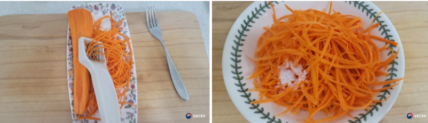 2. 채썬 당근에 소금 0.5작은술을 넣고 20분에 2~3번 정도 뒤집어 가며 절여둡니다.