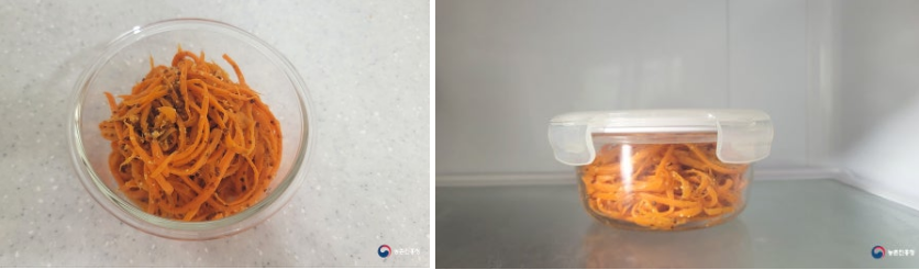 3. 잘 절인 채 썬 당근은 물기를 빼고 각각 분리해서 준비합니다.