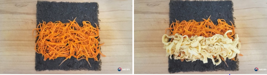 Tip : 김밥김의 80% 정도를 채워 줍니다. 당근 대신 달걀지단을 먼저 깔아도 좋습니다.