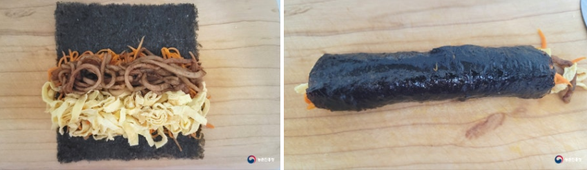 Tip : 김밥김의 80% 정도를 채워 줍니다. 당근 대신 달걀지단을 먼저 깔아도 좋습니다.