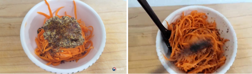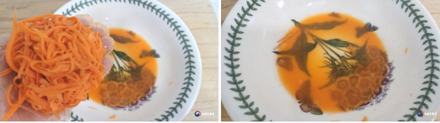 3. 잘 절인 채 썬 당근은 물기를 빼고 각각 분리해서 준비합니다.