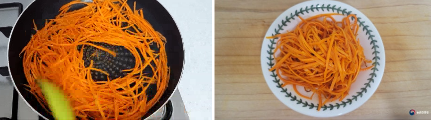 2. 기름 두른 팬에 채 썬 당근과 소금 1~2꼬집을 넣고 투명해질 때까지 볶아줍니다.