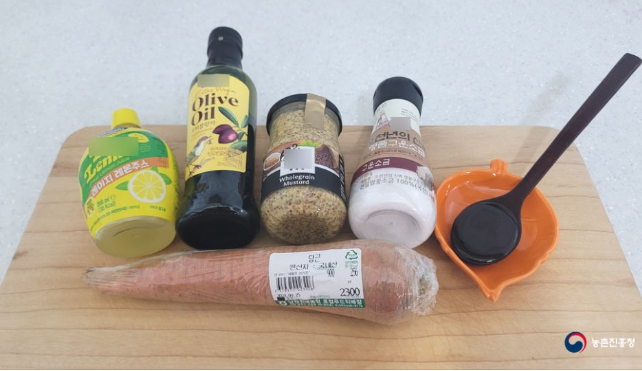 당근 1개(250g), 홀그레인머스터드 0.5큰술, 레몬즙 0.5큰술, 올리브유 1큰술, 꿀 또는 올리고당 1큰술, 소금 0.5작은술